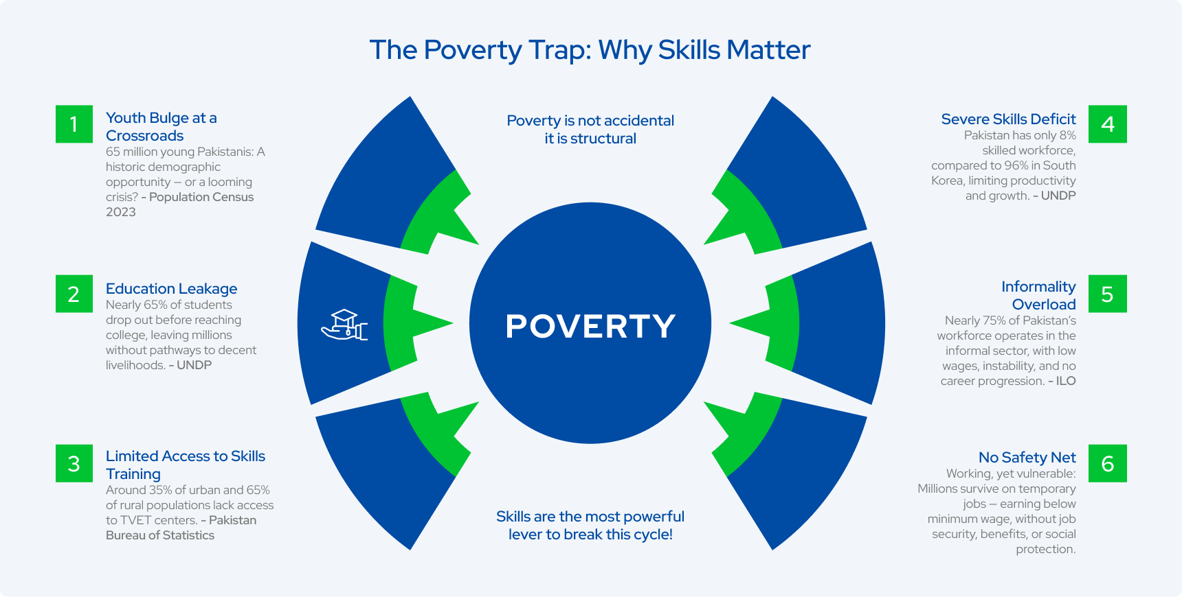 Pakistan has a very young population, with 67% (over 167 million) below 30 years of age, making it one of the youngest populations in the world. Within this group, almost 26% (around 65 million people) are aged 15–30. After accounting for graduates, there remain approximately 58 million young adults who are potentially skillable, representing both a major challenge and a golden opportunity for Pakistan.